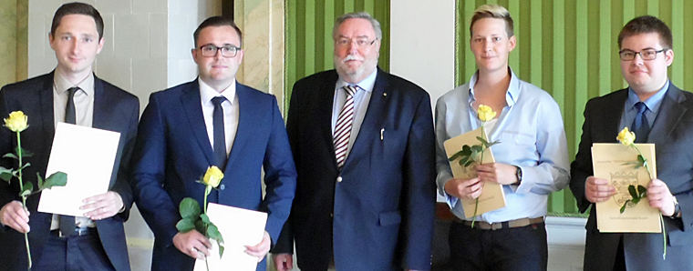 Schlitz. Svenja Faupel und Patrick Weißhaupt habe ihre Prüfung zur Verwaltungsfachangestellten bzw. zum Verwaltungsfachangestellten nach dreijähriger Ausbildungszeit bei der Stadt Schlitz mit Erfolg bestanden. Auch Johann Gekkel, Fachbereich Zentrale Dienste und Arne Bierwirth, Fachbereich Bürgerdienste haben den – ebenfalls dreijährigen – Fortbildungslehrgang zum „Verwaltungsfachwirt“ erfolgreich absolviert. Die Ausbildungen und Prüfungen erfolgten beim Hessischen Verwaltungsschulverband, Verwaltungsseminar Kassel, Seminarabteilung Fulda. Die Zeugnisübergabefeier fand in einem feierlichen Rahmen im Stadtschloss in Fulda statt. Bürgermeister Hans-Jürgen Schäfer und Ausbilderin Anja Rippl überbrachten ihre Glückwünsche. +++ fuldainfo | pm