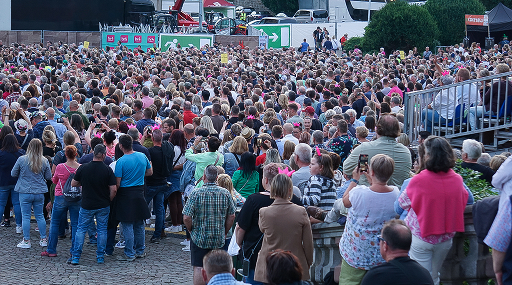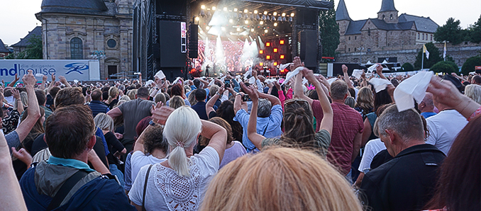 Mit dem wiederholten Gastspiel von Roland Kaiser (71) und seiner Band auf dem Domvorplatz sind am gestrigen Samstagabend vor über 8000 Besuchern die diesjährigen „Domplatzkonzerte“ in Fulda zu Ende gegangen. Nach Gastspielen von Eros Ramazzotti, Michael Patrick Kelly, Simply Red, der französischen Nouvelle-Chanson-Sängerin ZAZ, Johannes Oerding und den Fantastischen Vier haben mit dem gestrigen Konzertabend die seit vielen Jahren alljährlich in Fulda stattfindenden Domplatzkonzerte ein würdiges Veranstaltungsende genommen. 8500 treue Roland Kaiser-Fans begleiteten Ronald Keiler, wie der am 10. Mai 1952 in West-Berlin geborene Schlagersänger mit bürgerlichem Namen heißt, und sein Team bestehend aus Top Musikern bei guten Wetterverhältnissen durch einen zweieinhalbstündigen Konzertabend in Traumkulisse des Fuldaer Barockviertels. Viele der Konzertbesucherinnen und Konzertbesucher waren aus umliegenden Landkreisen und Bundesländern eigens des Roland Kaiser-Konzertes nach Fulda angereist, sehr zur Freude der Fuldaer Handeltreibenden und Gastronomen.