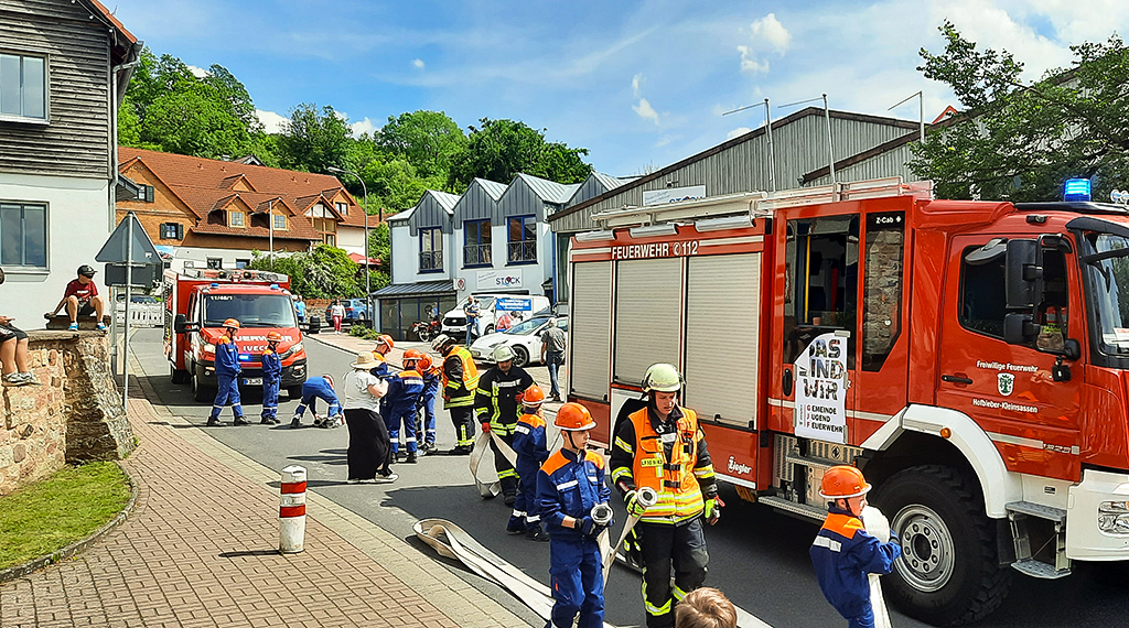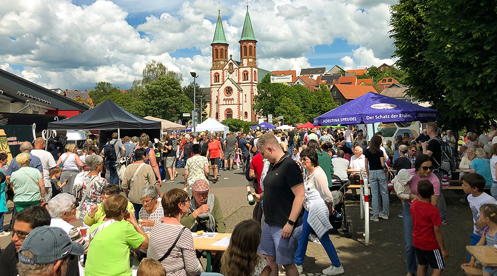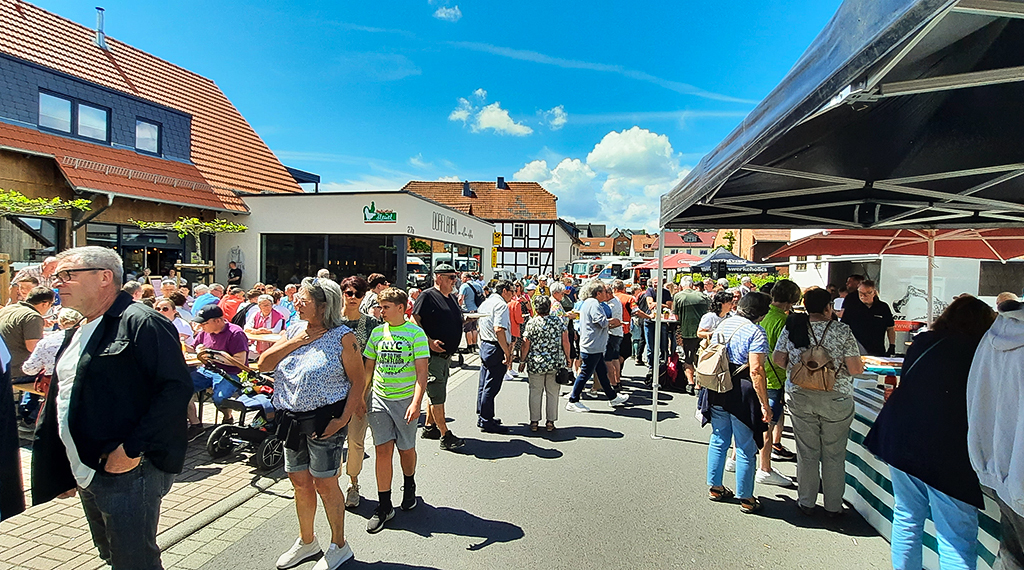 Insgesamt rund 70 Ausstellende waren seit den frühen Morgenstunden mit dem Aufbau ihrer Stände beschäftigt. Pünktlich ab 11 Uhr begann der Festbetrieb und die ersten Besuchenden strömten auf das Gelände. Die Gewerbemeile am Lindenplatz und in der Fuldaer Straße hielt ein vielseitiges Angebot der gemeindlichen Branchen-Spezialisten bereit. Einige ortsansässige Firmen, wie Wema Filmrequisiten, Ölmühle Rehberg, Dorfladen, Happy Wuffis und rhv öffneten ihre Türen, um den Gästen besondere Einblicke zu geben.