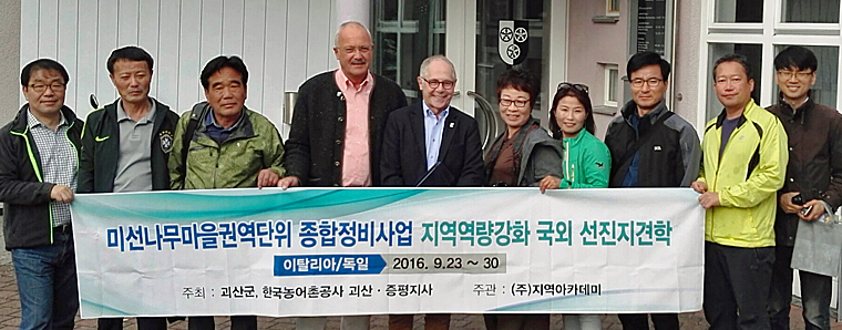 Dr. Hyun-Seok Oh, Leiter der Beratungsgruppe für ländliche und territoriale Entwicklung, berichtete in seinen Eingangsworten von massiver Landflucht in den dörflichen Regionen Südkoreas. Daher sei es von großem Interesse, mehr über Entwicklungspläne für die sich verändernden Rahmenbedingungen durch Globalisierung und demografischen Wandel zu erfahren. Nach kurzen Begrüßungsworten im Rathaus stellte Bürgermeister Manfred Helfrich in einem Kurzportrait die Gemeinde Poppenhausen mit ihren Besonderheiten vor. Ortsvorsteher und Arbeitskreisleiter Dorferneuerung Peter Detig erläuterte im Anschluss den koreanischen Gästen mit einer Bilderschau einen Querschnitt von Um- und Neubauten landwirtschaftlicher Gehöfte in Steinwand und Wohnhäusern in Poppenhausen im Rahmen der Dorferneuerung. Beeindruckt von der Vielzahl privater und öffentlicher Initiativen (Investitionen ca. 4,8 Mio. EURO in Summe) gab es korrespondierend viele Fragen zu den begleitenden Ausführungen des Arbeitskreisleiters und des Bürgermeisters. Vertieft wurden die Eindrücke der Delegation bei einem Rundgang in Poppenhausen und Steinwand, um Förderprojekte der Dorferneuerung Steinwand/Poppenhausen in der realen Umgebung kennenzulernen.