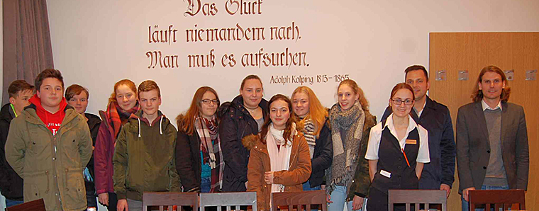 Jugendliche der Johannes-Kepler-Schule mit Peter Manns von RENSCH-HAUS (links) und Hannelore Jahn von Netzwerk Schulen (3. v.l.). Auch im ParkHotel Fulda waren zwei Gruppen des Netzwerks Schulen eingeladen. Geschäftsführer Christof Weisenborn führte die Jugendlichen der Bardoschule und der Lüdertalschule durch das 3-Sterne-Hotel und erläuterte die Geschichte des Hauses als ehemaliges Kolpinghaus Fulda. Er öffnete Hotelzimmer, zeigte Tagungsräume, Hotelküche und Restaurant und erklärte anschaulich, worauf es in den Gastronomieberufen ankommt. Das ParkHotel Fulda bildet Hotelfachleute und Koch/Köchin aus. Eine Auszubildende erzählte vom Alltag im Hotel und in der Berufsschule. Am besten gefalle ihr die Abwechslung im Beruf und der Umgang mit Gästen.