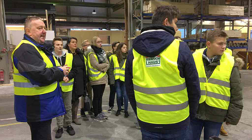Fulda. Für die Teilnehmerinnen und Teilnehmer des Projekts Netzwerks Schulen waren es wertvolle Praxiseinblicke, die sie während der Betriebserkundungen in den letzten Tagen gewinnen konnten. Als erste in diesem Schuljahr folgte eine Schülergruppe der Einladung des Holzfertighaus- Herstellers RENSCH-HAUS in Kalbach-Uttrichshausen. Mit großer Detailkenntnis erläuterte Peter Manns, gelernter Zimmermann und heute Betriebsrat, die Abläufe in der Entstehung eines Holzfertighauses. Das Familienunternehmen mit über 240 Mitarbeitern in fünfter Generation bildet Bauzeichner, Zimmerer und Kaufleute für Büromanagement aus. Im anschließenden Gespräch stellten die Acht- und Neuntklässler der Johannes-Kepler-Schule Neuhof noch viele Fragen zum Ausbildungs- und Arbeitsalltag bei RENSCH-HAUS.
