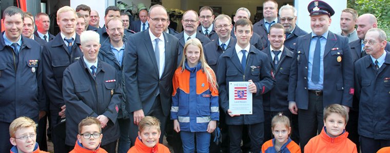 Hessens Innenminister Beuth und Bad Hersfelds Bürgermeister Thomas Fehling (r.) bei der Übergabe des Förderbescheides