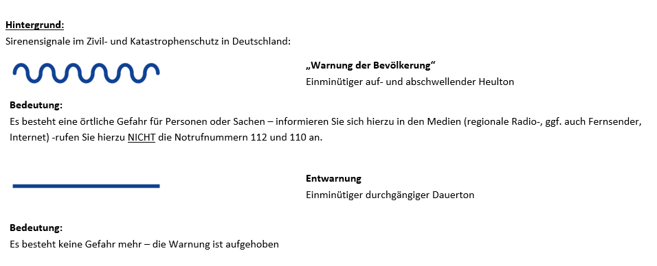 Der am kommenden Donnerstag stattfindende bundesweite Warntag soll die Menschen laut Hessens Innenminister Beuth (CDU) für Warnungen vor gefährlichen Ereignissen sensibilisieren. Zum bundesweiten Probealarm heulen um 11 Uhr erneut die Sirenen. Hintergrund und Ziel des Aktionstages ist es, die Bürgerinnen und Bürger für die verschiedenen Warnmittel und Alarmsignale zu sensibilisieren und die technische Warninfrastruktur zu testen. Neben Sirenen werden auch alle weiteren Warnmöglichkeiten, wie beispielsweise das vom Bund eingeführte „Cell-Broadcast“ oder die innovative Warn-App hessenWARN, zum Einsatz kommen. Sowohl das Sirenensignal für den Probealarm um 11 Uhr als auch für die Entwarnung um 11:45 Uhr dauern dann jeweils für eine Minute an.