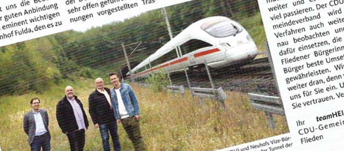 Die Bürger für Kalbach (BfK) haben in der Wahlwerbung der Christlich Demokratischen Union (CDU) Flieden gelesen, dass diese die Ausbauvariante IV durch Kalbacher Gebiet befürworten. Wie im Anhang 1 zu sehen ist, wird dies mit einem Bild beworben, auf dem unter anderem der Fliedner Bürgermeister Christian Henkel (CDU), der Landtagsabgeordnete Markus Meysner (CDU) und der Neuhöfer Erste Beigeordnete Franz-Josef Adam (CDU) in Mittelkalbach vor dem Landrückentunnel zu sehen sind (das Bild entstand im Rahmen einer Begehung 2018).