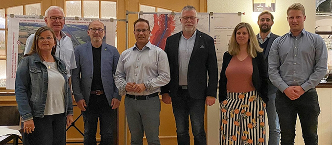 Stadtverordnete Elke Hohmann (Volt), BI-Vorsitzender Paul Schneider, MdL Markus Hofmann (Bündnis 90/Die Grünen), MdB Jürgen Lenders (FDP), Ortsvorsteher Stefan Ihrig (CDU), sowie die Stadtverordneten Marie-Louise Puls (Bündnis 90/Die Grünen), Dr. Sebastian Koch (FDP), Benedikt Ihrig (CDU) (v.l.) Foto: privat