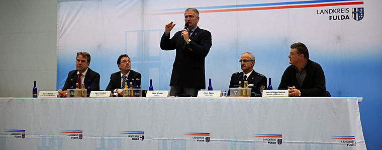 Wie Woide weiter deklarierte, ist es ihm wichtig, in derzeitiger Flüchtlingssituation, keine Turnhallen und Bürgerhäuser als Aufnahmelager zur Nutzung bereitzustellen: „Das geht nicht, wir haben den Schul- und Vereinssport, wir können nicht unser gesamtgesellschaftliches Leben verändern oder Abstriche machen, deshalb muss man nach anderen Lösungen suchen, schauen, wo sich leerstehende Gebäude für eine Unterbringung anbieten“, so der Landrat des Landkreises Fulda. Natürlich habe sich das Stadt- und Landschaftbild die letzen Wochen und Monate verändert, es bestehe aber kein Grund zur Sorge oder gar Furcht vor den Flüchtlingen. Wie auch schon auf vergangenen Informationsveranstaltungen – hatten die Fragen der Bürgerinnen und Bürger aus dem Königreich denselben Konsens: Registrierung und Überwachung der Flüchtlinge, Gesundheitsrisiko, Ängste vor zunehmender Kriminalität. „Könnte man nicht darüber nachdenken, den Flüchtlingen – ‚in ihrer Sprache‘ – eine Art ‚Verhaltenscodex‘ auszuhändigen, wie man sich in Deutschland und speziell in Flieden zu benehmen habe?“ oder „Ist es richtig, dass man ‚in puncto Notunterkunft‘ keinerlei Informationen über diese Menschen hat und demnach nicht weiß, wen wir uns da ins Land holen?“ so einige Fragen der Bürger aus der Kerngemeinde Flieden. Ein Bürger wunderte sich, warum bis jetzt noch keine Flüchtlinge in Künzell oder Petersberg untergebracht wurden. Auch diesen Fragen stand am Montagabend Bernd Woide Rede und Antwort. „Da die Flüchtlinge, die in einer Notunterkunft – und demnach ’nur vorübergehend‘ – untergebracht werden, auf der Durchreise sind, dürfen wir sie nicht registrieren. Das geschieht erst in den Erstaufnahmeeinrichtungen, nach dessen Bezug, die Menschen dann auch Asyl beantragen. Was das Vermitteln unserer Werte betrifft, tun wir mit Hilfe von Dolmetschern alles, um Konflikten vorzubeugen. Was die Aufnahmen in den Gemeinden Künzell und Petersberg betrifft, da pass´ ich schon drauf auf, dass auch dort eine gerechte Verteilung berücksichtigt wird „, so Woide.