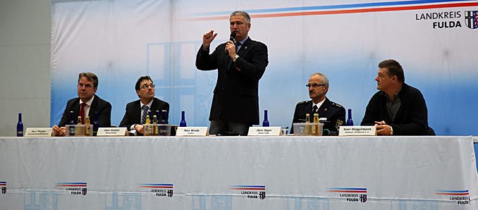 Wie Woide weiter deklarierte, ist es ihm wichtig, in derzeitiger Flüchtlingssituation, keine Turnhallen und Bürgerhäuser als Aufnahmelager zur Nutzung bereitzustellen: "Das geht nicht, wir haben den Schul- und Vereinssport, wir können nicht unser gesamtgesellschaftliches Leben verändern oder Abstriche machen, deshalb muss man nach anderen Lösungen suchen, schauen, wo sich leerstehende Gebäude für eine Unterbringung anbieten", so der Landrat des Landkreises Fulda. Natürlich habe sich das Stadt- und Landschaftbild die letzen Wochen und Monate verändert, es bestehe aber kein Grund zur Sorge oder gar Furcht vor den Flüchtlingen. Wie auch schon auf vergangenen Informationsveranstaltungen - hatten die Fragen der Bürgerinnen und Bürger aus dem Königreich denselben Konsens: Registrierung und Überwachung der Flüchtlinge, Gesundheitsrisiko, Ängste vor zunehmender Kriminalität. "Könnte man nicht darüber nachdenken, den Flüchtlingen - 'in ihrer Sprache' - eine Art 'Verhaltenscodex' auszuhändigen, wie man sich in Deutschland und speziell in Flieden zu benehmen habe?" oder "Ist es richtig, dass man 'in puncto Notunterkunft' keinerlei Informationen über diese Menschen hat und demnach nicht weiß, wen wir uns da ins Land holen?" so einige Fragen der Bürger aus der Kerngemeinde Flieden. Ein Bürger wunderte sich, warum bis jetzt noch keine Flüchtlinge in Künzell oder Petersberg untergebracht wurden. Auch diesen Fragen stand am Montagabend Bernd Woide Rede und Antwort. "Da die Flüchtlinge, die in einer Notunterkunft - und demnach 'nur vorübergehend' - untergebracht werden, auf der Durchreise sind, dürfen wir sie nicht registrieren. Das geschieht erst in den Erstaufnahmeeinrichtungen, nach dessen Bezug, die Menschen dann auch Asyl beantragen. Was das Vermitteln unserer Werte betrifft, tun wir mit Hilfe von Dolmetschern alles, um Konflikten vorzubeugen. Was die Aufnahmen in den Gemeinden Künzell und Petersberg betrifft, da pass´ ich schon drauf auf, dass auch dort eine gerechte Verteilung berücksichtigt wird ", so Woide.