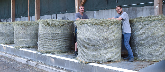 Auf Heumilch haben die beiden vergangenes Jahr gesetzt – und ihren Betrieb umstrukturiert. Für Eiferts ist es eine Mischung aus Einstellung und Betriebswirtschaft, die sie zu diesem Schritt bewogen haben. Nun ist der Betrieb nicht nur nach Bioland-Richtlinien, sondern auch mit dem EU-Gütesiegel „Heumilch – garantiert traditionelle Spezialität“ zertifiziert. „Unsere Kühe sind nicht so anfällig, geben zwar weniger Milch, sind aber viel gesünder“, sagt der Biolandwirt. Die geringere Milchleistung werde durch den Ertrag ausgeglichen, die Milch eigne sich besser zur Herstellung von Käse, da beispielsweise Clostridien-Bakterien, die die Käseherstellung beeinträchtigen können, und unter anderem über Silagefutter aufgenommen werden, bei Heumilchproduktion eine Nebensache seien. „Und außerdem ist es Teil unserer Philosophie. Wir wollen nachhaltiger wirtschaften, unseren eigenen Rhythmus finden und hochwertige Nahrungsmittel produzieren“, sagt Eifert. Ihnen selbst gehe es damit besser, „man steht weniger unter Druck, das Landwirt-sein ist etwas entspannter. Klasse statt Masse!“, unterstreicht Eifert seine Einschätzung. Die Kühe gehen in der Weidesaison von etwa April bis Oktober raus auf die Weide. Im Laufstall bekommen sie zusätzlich zum Heu noch Schrot aus eigenem Getreide und Erbsen sowie etwas Mineralfutter. Um dafür genügend hochwertiges Heu parat zu haben, haben sie sich eine Heutrocknung gebaut. „So kann ich den Zeitpunkt zum Mähen etwas flexibler bestimmen und die Ernte dann beginnen, wenn die Grasqualität am besten ist“, sagt Eifert. Allerdings müssen sie die Kapazität der Anlage, auf der 20 Rundballen gleichzeitig getrocknet werden können, im Auge behalten. Sie haben sich umgehört, in Internet-Foren gelesen, sich Informationen von Beratern geholt – und sich schließlich dazu entschieden, sich eine Anlage selbst zu bauen.