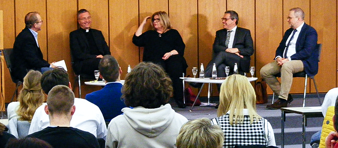 Eine bedenkenswerte Antwort zum Thema des Abends lieferte Fuldas Bischof selbst zum Schluss der Diskussionsrunde. „Es gibt kein goldenes Zeitalter“, nach dem sich mancher vielleicht zurücksehne. Kirchliche Vision müsse vielmehr „immer nach vorne gerichtet sein.“ „Zukunft gibt es“, gab sich Gerber hoffnungsvoll, „aber nur im Miteinander.“ Mit diesem Satz schloss sich der Kreis zu Gerbers vorausgegangenen Äußerungen, worin er unter anderem betont hatte, dass sich Christen gerade auch „um andere kümmern.“ „Das Wertvolle im Menschen sehen, darum gehe es dem Christentum.“ Vor dem Hintergrund persönlicher Eindrücke – bereits als acht-Jähriger hatte er die Gedenkstätte Dachau besucht, was ihn nach eigenem Bekunden sehr geprägt hat – bekräftigte der Bischof die „Verantwortung, die wir vor der Geschichte haben.“ Gerade deshalb müsse das „Erbe aus Judentum und Christentum in diesen Tagen stark gemacht werden.“