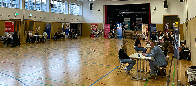Im Vorfeld des Speed-Datings hatten die Schülerinnen und Schüler die Gelegenheit, sich für ein Unternehmen ihrer Wahl zu entscheiden und sich dort schriftlich zu bewerben. Die teilnehmenden Betriebe präsentierten dabei ihre Ausbildungs- und Dualen Studiengänge, aus denen die Jugendlichen ihre bevorzugten Angebote auswählen konnten. Beim anschließenden Aufeinandertreffen ging es nun darum, ein Vorstellungsgespräch zu simulieren. Zehn Minuten Zeit hatten die Oberstufenschülerinnen und -schüler, um sich zu präsentieren, fünf Minuten gehörten den Unternehmen, die den potenziellen Arbeitnehmern Feedback gaben, nicht geschönt, sondern real.
