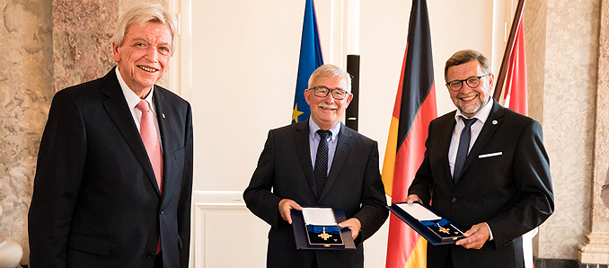 Bekamen den Hessischen Verdienstorden von Ministerpräsident Volker Bouffier überreicht: Berthold Jost (l.) und Dr. Eberhard Fennel (rechts). Foto: Staatskanzlei/Ralf Riehl