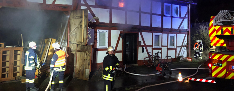 In Burghaun kam es am frühen Montagmorgen zu einem dramatischen Einsatz für die Feuerwehr. Gegen 5 Uhr wurden die Einsatzkräfte zum Brand in einem Fachwerkhaus im Ortsteil Großenmoor gerufen. Beim Eintreffen brannte es im Obergeschoss des Gebäudes, dichter Rauch drang aus den Fenstern. Sofort leiteten die Retter einen Innenangriff ein, da sich der Besitzer noch in dem Gebäude befinden sollte. Wenig später gelang es den Trupps, den Hund des Hausbesitzers aus dem völlig verqualmten Gebäude zu holen. Völlig verwirrt und mit Ruß überzogen irrte das Tier dann an der Einsatzstelle herum, bis Nachbarn es gelang, den Hund einzufangen. Wenig später mussten die Einsatzkräfte den Innenangriff sogar abbrechen, da das Gebäude droht einzustürzen. Etwa zwei Stunden später entdecken Einsatzkräfte den Leichnam im Obergeschoss des Hauses. Die Brandermittler des hessischen Landeskriminalamtes und der Kripo Fulda haben die Ermittlungen zur Identitätsfeststellung der Person und zu der Brandursache aufgenommen. Am Gebäude entstand nach derzeitigen Schätzungen ein Schaden von circa 70.000 Euro. +++