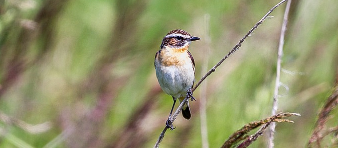 Das Braunkehlchen ist 12 bis 14 Zentimeter groß und hat seinen Namen von seiner braun-orangen Brust und Kehle. Wegen seines weißen Augenstreifs wird es auch „Wiesenclown“ genannt. Sein typischer Lebensraum sind feuchte Wiesen, Brachen und Feldränder. Wichtig sind einzelne Büsche, hohe Stauden oder Zaunpfähle, die als Sing- und Ansitzwarte genutzt werden. Der Wiesenvogel hat eine besondere Strategie, um sich vor Fressfeinden zu schützen. „Wenn ein Greifvogel am Himmel auftaucht, nimmt das Braunkehlchen eine regungslose ,Pfahlstellung‘ ein und versucht so, sich unsichtbar zu machen“, erklärt NABU-Vogelexperte Maik Sommerhage. Das Braunkehlchen ernährt sich von Insekten, Spinnen und Würmern und ist deshalb auf insektenreiche Grünländer angewiesen. Im Spätsommer gehören auch Beeren zum Nahrungsspektrum.