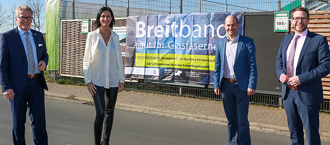 Starten in den Schlussspurt beim Gewerbegebiete-Ausbau (von links): Kreisbeigeordneter Winfried Ottmann, Breitband-Geschäftsführerin Simone Roth, Freigerichts Bürgermeister Dr. Albrecht Eitz und Landrat Thorsten Stolz. Foto: B&R