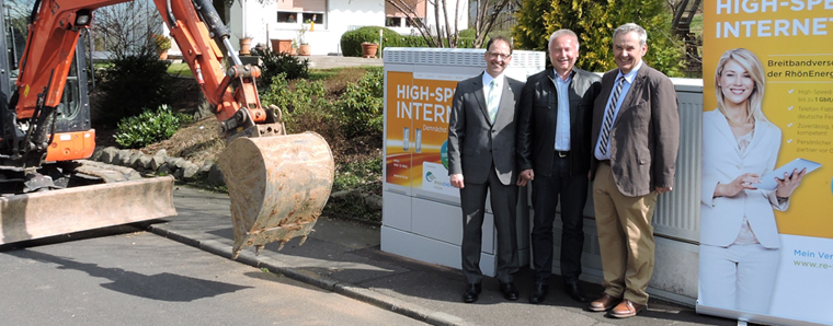 Hilders. Die RhönEnergie Fulda erschließt im Rahmen des flächendeckenden Ausbaus des Landkreises mit schnellem Breitband-Internet nun auch die Marktgemeinde Hilders. Offizieller Beginn der Baumaßnahmen war am gestrigen Freitag. Der Bürgermeister von Hilders, Hubert Blum, sowie Vertreter der RhönEnergie und deren Kooperationspartner Überlandwerk Rhön, die zum Ausbau beitragen, waren vor Ort.