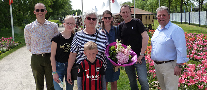 Riesenüberraschung für Brigitte Fröhlig (3. von links) und ihre Familie beim ersten Besuch auf der Landesgartenschau: Stadtbaurat Daniel Schreiner (links) und LGS-Geschäftsführer Ulrich Schmitt (rechts) überreichten der Petersbergerin als 100.000ste Besucherin einen Blumenstrauß und einen Geschenkgutschein für die Gastronomie auf der LGS. Foto: LGS Fulda
