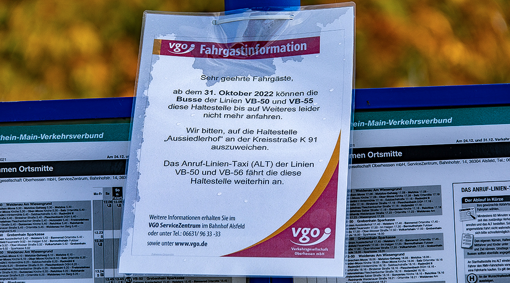 Die Gemeinde Grebenhain strebe an, im nächsten Jahr die Betonplatte der Brücke neu zu bauen. „Die Widerlager sehen noch ganz gut aus“, so Bürgermeister Stang. Geplant ist eine Bauzeit bis in den Herbst 2023. In Zahmen sei das Problem, dass der Bus im Ort wenden muss. Bisher konnte er über die Brücke fahren, entlang der „Hosenfelder Straße“ um somit wieder auf die Ortsdurchfahrt zu gelangen. „Das ist jetzt leider nicht mehr möglich, sodass Zahmen nun eine ‚Sackgasse‘ ist“, so Bürgermeister Stang. Das Rückwärtsfahren der Busse sei im Rahmen der Unfallverhütungsvorschriften der vgo und der Busfahrer so nicht gestattet. Es sei nach einer Wendemöglichkeit gesucht worden, wo der Bus quasi drehen kann. „Nach einer Prüfung der vgo ist derzeit keine Wendemöglichkeit gegeben. Nun müssen die Kinder auf einer Strecke von rund 500 Meter aus dem Ort herauslaufen um bei der Ersatzhaltestelle beim Aussiedlerhof ein- bzw. aussteigen zu können. Diese Haltestelle kann der Bus direkt anfahren und muss nicht mehr in den Ort.