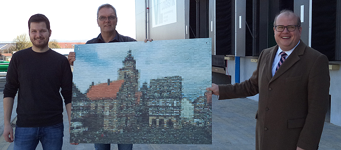 Coronabedingt in ganz kleinem Rahmen überreichte er ein Präsent der Stadt Alsfeld, ein Mosaik des Rathauses bestehend aus Bildern der Fa. Völker, an die Herren Reinhold und Niko Völker und bedankte sich für das unternehmerische Engagement in Alsfeld. Reinhold Völker, Gründer und geschäftsführender Gesellschafter von Völker Logistik, lobte im Anschluss die Projektbeteiligten: