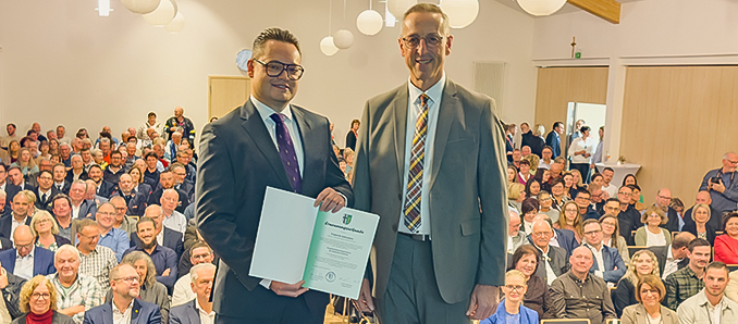 Vor zahlreichen Gästen aus Politik, Vereinen und Verwaltung erhielt Hohnstein, der im Mai 2025 mit 59,6 Prozent der Stimmen gewählt wurde, seine Ernennungsurkunde und legte den Amtseid ab. In seiner Rede kündigte er an, die Gemeinde mit „Demut und Verantwortungsbewusstsein“ zu führen und trotz angespannter Finanzlage auf einen sorgsamen Einsatz öffentlicher Mittel zu achten.