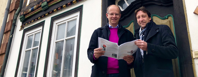 MdB Michael Brand und Stephan Koch, Vorstand der Aktiv-Stiftung vor dem Elf-Apostel-Haus in Tann