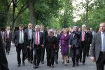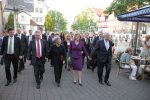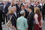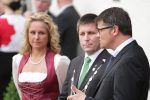 Früher als geplant war der Konvoi des Präsidenten eingetroffen. Bei „Kaiserwetter“ mit hochsommerlichen Temperaturen begrüßte Oberbürgermeister Gerhard Möller mit Amtskette Ehepaar Fischer, bevor es zum eigentlichen Pressetermin, dem obligatorischen Eintrag ins „Goldene Buch“ der Stadt, in den Dalbergsaal ging. Bereits im Ehrenhof signalisierte Bundespräsident Fischer mit sympathischem Lächeln sein großes Interesse an Fulda. Denn zum ersten Mal war er zu Gast in der Domstadt. Während sich Präsidentengattin Margit besonders für die „süßen Teller“ der Sammlung fuldischen Porzellans interessierte, war Ehepaar Fischer unisono beeindruckt vom sorgfältig restaurierten Spiegelkabinett als wahrem „Schatzkästlein“ des Schlosses, von dem aus die Gäste einen wunderbaren Blick auf den Dom sowie das Bonifatiusdenkmal genossen. Vom Kaisersaal mit einem Portrait des Habsburgers Karl VI. führte der Weg des Bundespräsidenten samt protokollarischer Begleitung durch den Schlossgarten, in dem Margit Fischer für einen kurzen Moment den Musikern auf der Bühne des Schlaufuchsfestes lauschte, bevor die österreichischen Gäste einen Rundumblick auf Michaelskirche und Dom werfen konnten, in dem Bonifatius begraben liegt. Gemeinsam mit Tourismus- und Kongressmanagementleiterin Elisabeth Schrimpf erläuterte OB Möller seinen Gästen die weit zurückreichenden historischen Wurzeln Fuldas bis hin zur Reichs- und Papstunmittelbarkeit der fuldischen Landesherrschaft. Mit Sänger Andreas Gabalier wird übrigens in Kürze ein weiterer Gast aus Österreich in Osthessen erwartet. Er gastiert im Rahmen der „Open Air Konzerte“ auf dem Domplatz.