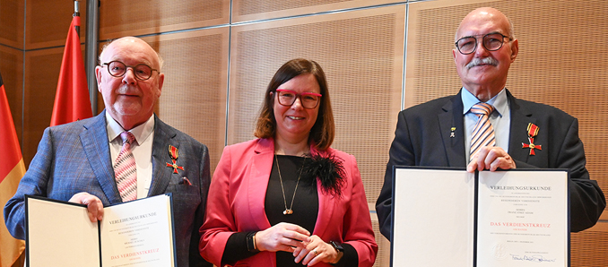 Für ihr jahrzehntelanges ehrenamtliches Engagement in der Kommunalpolitik und im sozialen Bereich sind Franz Josef Adam aus Neuhof (Landkreis Fulda) und Michael Duschka aus Lauterbach (Vogelsbergkreis) mit dem Verdienstorden am Bande ausgezeichnet worden. Staatssekretärin Manuela Strube überreichte die Auszeichnungen stellvertretend für Bundespräsident Frank-Walter Steinmeier am Dienstag in der Hessischen Staatskanzlei.