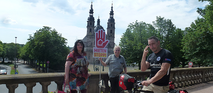 In mehr als 80 Städten fanden am Samstag Aktionen für einen bundesweiten sechsjährigen Mietenstopp statt. In Fulda beteiligt sich die Initiative für bezahlbaren Wohnraum und der Kreisverband des Deutschen Gewerkschaftsbundes. Die Initiative für bezahlbaren Wohnraum, die bereits eine Eingabe an die Stadtverordnetenversammlung zur Gründung einer kommunalen Wohnungsbaugesellschaft auf den Weg brachte, führt eine Fotoaktion vor Fuldaer Wahrzeichen durch.