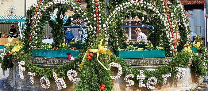 Sie kündigen Jahr für Jahr das Osterfest an und sind dazu noch echte Hingucker. Die Rede ist von den sogenannten „Osterbrunnen“. In vielen Pfarrgemeinden des Bistums Fulda gehört das Schmücken der Brunnen seit vielen Jahren zur festen Tradition. Auch in Eichenzell zieren bunte Ostereier und farbenfrohe Schleifen den Brunnen am Türmchen in der Ortsmitte.