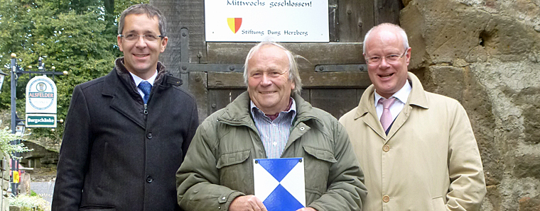 Breitenbach am Herzberg. Die Burg Herzberg ist mit dem internationalen Schutzzeichen für besonders bewahrenswerte Kulturgüter ausgezeichnet worden. Gemeinsam mit Landrat Dr. Michael Koch übergab der Präsident des Landesamtes für Denkmalpflege das Schild nach der Haager Konvention an Jürgen Freiherr von Dörnberg.