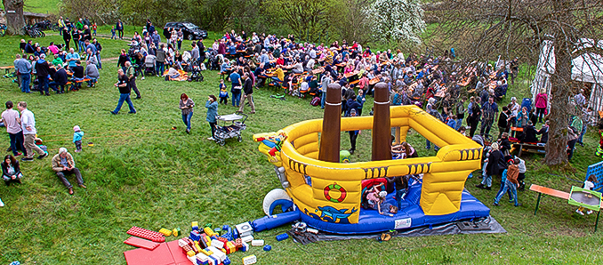 Schönes Wetter, Steaks und Würstchen vom Holzkohlegrill, Kaffee und Kuchen, Hüpfburg und Großspielgeräte, ideale Voraussetzungen für ein gelungenes Burgfest auf der Burgruine Wartenberg am 1. Mai.