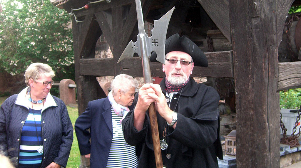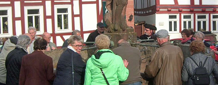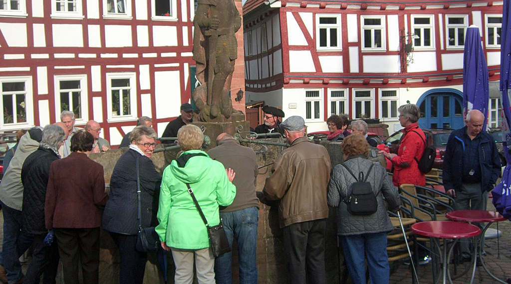 Schon am altehrwürdigen Ziehbrunnen im Bereich der Vorderburg wartete Gottfried Ickler, einer der beiden Nachtwächter von Schlitz und ebenfalls kein waschechter Schlitzerländer, auf die sich auf Wanderung befindliche Sängerfamilie. Auch mit diesem, man könnte ihn durchaus Original nennen und seinen angeeigneten Kenntnissen über den historischen Teil der inzwischen nur noch 9500 Einwohner zählenden Stadt, inklusive der 16 Dörfer, auf der mit 142 Quadratkilometern drittgrößten Fläche Hessens, wurden Wanderteilnehmerinnen und Teilnehmer angenehm überrascht.