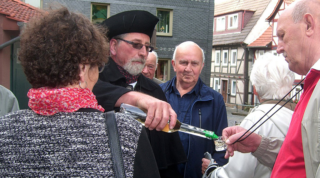 Dass er seine Führungen nicht nur mit schlagfertigen Aussagen und lustigen Sprüchen, sondern auch noch mit dem Ausschank, von einigen Produkten der stadteigenen Destillerie, in der er als Meister seinem Beruf nachgeht, würzt, wurde äußerst überrascht angenommen und mit Beifall belohnt. Diese traditionelle Wanderung fand schließlich ihren Abschluss in der sehr empfehlenwerten Gastsätte Rohrgass „Im Grund“, wo sich ein neues Pächterehepaar, aufmerksam und rundum empfehlenswert um seine Gäste bemüht. Über noch mehr Details soll hier nicht berichtet werden, damit dem Besuch und der Teilnahme an diesen Attraktionen nicht vorweg der Reiz geschmälert wird. +++ fuldainfo | hans schmidt