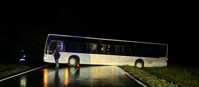 Gegen 21:35 Uhr meldete ein Verkehrsteilnehmer der Polizei, dass der Bus quer auf der Fahrbahn stehe. Bei der Überprüfung stellten die Beamten fest, dass das Fahrzeug auf der Straße aufsaß und die Hinterachse über dem Straßengraben schwebte. Zur Bergung musste ein Autokran angefordert werden.