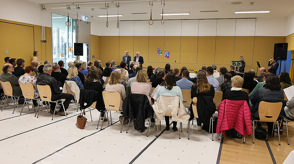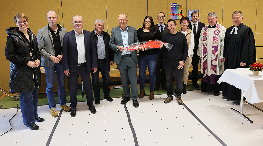 Auch Stadtbaurat Daniel Schreiner ordnete das Projekt ein. Es sei „ein wichtiges Zeichen in einer schwierigen Zeit“, sagte er und verwies darauf, wie notwendig es sei, sich dieser Verantwortung zu stellen. Gemeinsam mit dem Oberbürgermeister überreichte er im Rahmen der Einweihung ein Geschenk – eine Geste, die den Dank der Stadt unterstrich.