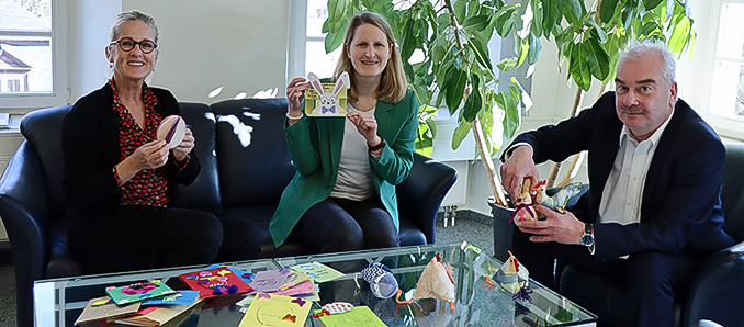 „Es ist toll zu sehen, wie viel Mühe sich die Kinder wieder gemacht haben“, betonte Diözesan-Caritasdirektor Dr. Markus Juch bei einer Begutachtung einiger der Zusendungen, die er in seinem Büro gemeinsam mit der Leiterin des Direktionsoffice, Kerstin Heinsch sowie mit Ann-Katrin Jehn vom Referat Presse- und Öffentlichkeitsarbeit vornahm. „Schon bei unseren Briefaktionen während der Pandemie – damals für die Seniorinnen und Senioren hier in den Altenpflegheimen im Bistum – kamen unzählige schön gestaltete Briefe zusammen. Zu diesem Osterfest jetzt wollen wir nun den Kindern der Binnenflüchtlinge in der Ukraine eine kleine Freude machen und freuen uns über die große Beteiligung“, so Caritasdirektor Juch.
