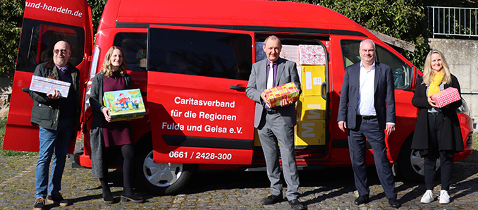 Bunte Päckchen, Kartons und Geschenktüten – der rote Caritas-Bus war vollgepackt mit kleinen Aufmerksamkeiten. Denn die Mitarbeitenden des Caritasverbandes für die Diözese Fulda und des Caritasverbandes für die Regionen Fulda und Geisa wollen den Flüchtlingen nach ihrem langen Weg nach Deutschland eine kleine Freude machen und für einen guten Start in der Caritas-Unterkunft sorgen. Deshalb wurde im Team fleißig gesammelt. Die Zahl der Päckchen war überwältigend. Darin jeweils enthalten: Zahnbürste, Zahnpasta, Duschgel, Shampoo, Seife, Desinfektionsmittel, FFP2-Masken, Waschlappen, Müsliriegel und ein Überraschungs-Ei.