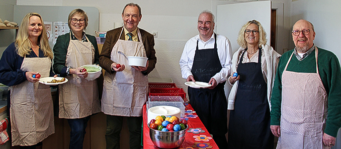Dreimal wöchentlich öffnete die Caritas im Bistum Fulda seit November 2022 ihre Pforten in der Fuldaer Wilhelmstraße für Wohnungslose und sozial schwächer Gestellte, um ihnen bei einer warmen Suppe sowie eines heißen Getränks beizustehen und ihnen zuzuhören. Ergänzt wurde das kostenfreie Angebot, das am 30. März dieses Jahres auslief, mit der Möglichkeit zum Gespräch von Mitarbeitern der Caritas des Bistums Fulda aus dem Haupt- und Ehrenamt mit Beratungsangeboten der Caritas wie der allgemeinen Sozialberatung oder Schuldnerberatung. Mit der Aktion „Grüne Soße für Hilfebedürftige“ am heutigen Gründonnerstag verabschiedete sich das Projekt HOTRoom. Neben dem Diözesan-Caritasdirektor des Caritasverbandes in Fulda, Dr. Markus Juch, der Geschäftsführerin des Caritasverbandes für die Regionen Fulda und Geisa, Susanne Saradj sowie ihres Stellvertreters, Werner Althaus sowie Ansgar Erb, Vorstandsmitglied der Caritas im Bistum Fulda, beteiligte sich auch die Präsidentin des Deutschen Caritasverbandes, Eva Maria Welskop-Deffaa, bei der Essensausgabe in den Räumlichkeiten in der Wilhelmstraße 6.