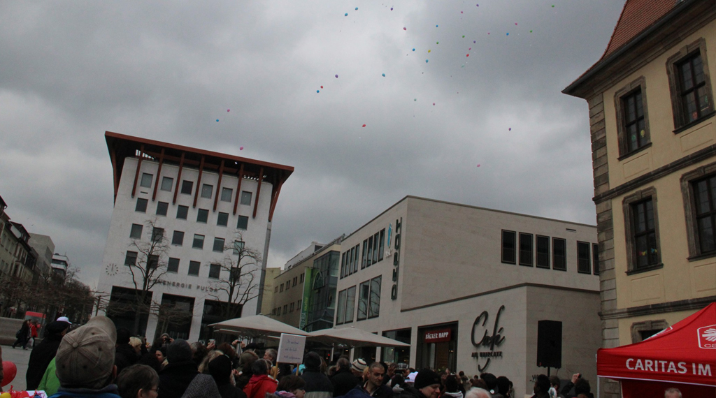Den Abschluss machte Behindertenhilfe-Ressortleiter Dominique Vilmin. Er unterstrich, dass jeder Mensch normal sei – auf seine ganz individuelle Weise. Parallel zu der Kundgebung lief eine Graffiti-Aktion, bei der jeder mit Sprühfarben auf einer Leinwand dazu beitragen konnte zu zeigen, wie bunt die Caritas und Fulda sind. Zum Abschluss ließen die Kundgebungsteilnehmer unter einem erneuten Carisma-Trommelwirbel bunte Luftballons mit Botschaften gegen Rassismus und Ausgrenzung steigen. +++ fuldainfo
