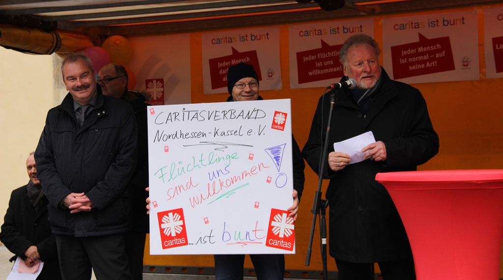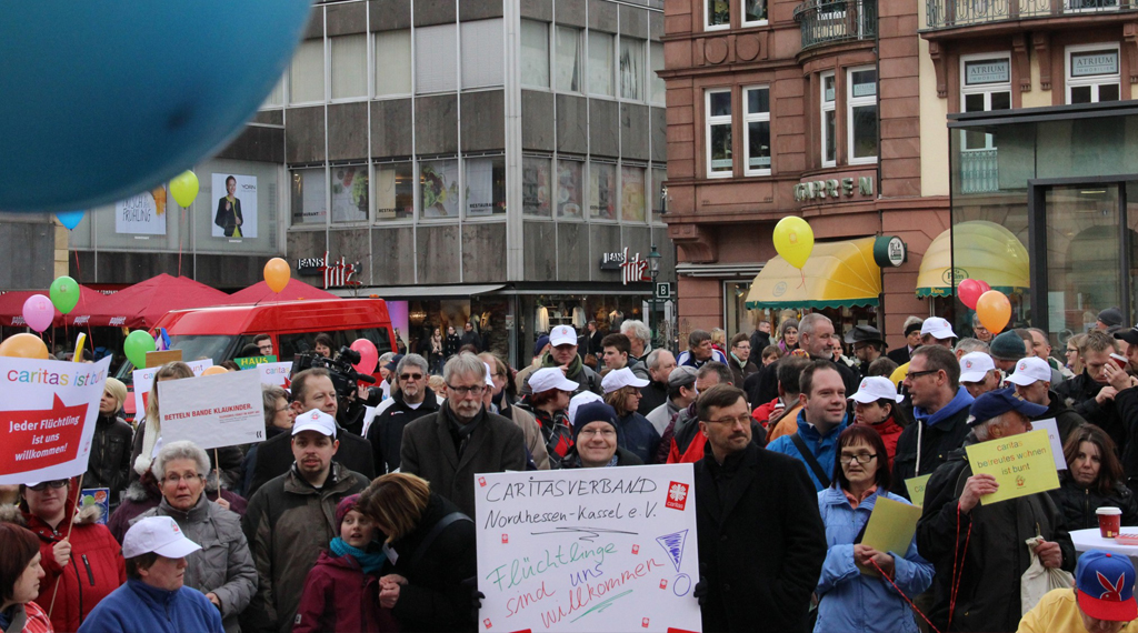 Die Trommelgruppe der Carisma Werkstätten sorgte für die Aufmerksamkeit der Passanten. Anschließend sprach Diözesan-Caritasdirektor Dr. Markus Juch kurz über die Intention der Caritas-Kundgebung, die im Rahmen der Internationalen Wochen gegen Rassismus durchgeführt wurde. Anschließend kamen Statements von Caritas-Vorstandmitglied Malte Crome, der deutliche Worte gegen Rassismus in Deutschland setzte, und dem Kasseler Caritas-Geschäftsführer Meinolf Schaefers, der zur Flüchtlingshilfe sprach und für eine positive Willkommenskultur warb. Altenhilfe-Ressortleiter Achim Eng betonte, wie wichtig es sei, dass jeder Mensch in Würde altern dürfe.