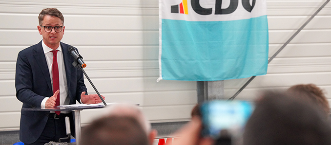 Mit mehr als 480 Mitarbeitenden produziert Fahrzeugteile Wagner seit 1948 Fahrzeugteile, die weltweit zum Einsatz kommen. Frederik Schmitt stellte Carsten Linnemann, gelernter Volkswirt und seit 2009 Mitglied des Deutschen Bundestags, mit diesen Worten vor: „Er ist bekannt für seine Überzeugung, Dinge einfach mal zu machen. Das sollten wir uns alle zu Herzen nehmen.“ Schmitt blickte auf die Perspektiven für Deutschland: „Unser Land braucht Freiheit, Verlässlichkeit und Klarheit.“