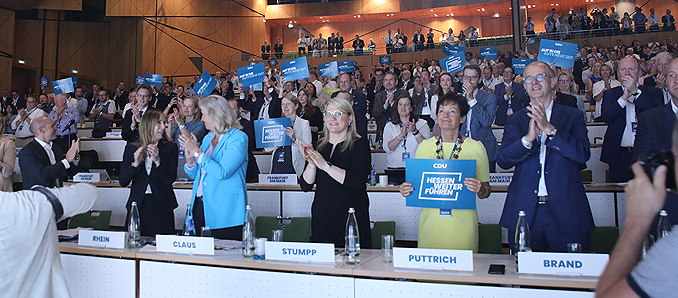 Auf die Plätze zwei und drei der Landesliste wählte die CDU Hessen die Fraktionsvorsitzende im Hessischen Landtag, Ines Claus, und die Landtagspräsidentin Astrid Wallmann. „Ich freue mich sehr, dass wir auf den ersten drei Plätzen zwei starke Frauen haben“, sagte Rhein. Auf den Positionen vier und fünf treten an CDU-Generalsekretär Manfred Pentz und die erfahrende Sozialpolitikerin Claudia Ravensburg aus Nordhessen. „Mit überwältigender Mehrheit haben sich die 330 Delegierten für ein Zukunftsteam für Hessen entschieden. Eine Liste mit perfekter Mischung aus Erfahrung und Erneuerung, jünger und weiblicher als je zuvor,“ so Rhein. Generalsekretär Manfred Pentz sagte: „Der Parteitag war der modernste, den die CDU Hessen je organisiert hat. Wir haben nicht nur der Landesliste mit unseren starken Kandidatinnen und Kandidaten zugestimmt, sondern wir haben auch ein hervorragendes Zukunftsprogramm für Hessen beschlossen.“ Boris Rhein, der Spitzenkandidat der CDU Hessen, sagte zum Programm: „Mit der Vorsitzenden der CDU-Fraktion im Hessischen Landtag Ines Claus an der Spitze der Programmkommission und unter Mitwirkung aller Gliederungen und Vereinigungen hat die CDU Hessen ein starkes Paket geschnürt. Ein Zukunftsprogramm voller Ideen für unser Land. Ideen, die Hessen weiterführen. Und unser Zukunftsprogramm ist dieses Mal anders. Während die Wahlprogramme in den vergangenen 70 Jahren um sage und schreibe 692 Prozent länger geworden sind, machen wir es dieses Mal anders: Wir haben 33 zentrale Themen und dazu jeweils 5 klare Ideen und Positionen. Das macht insgesamt 165 relevante Maßnahmen für unser Land.“