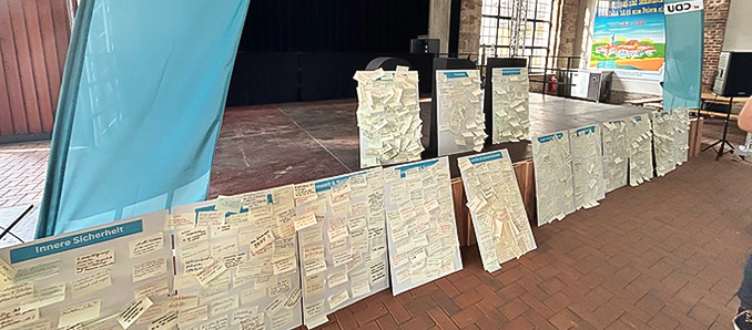 Im Mittelpunkt stand eine eigens konzipierte Programmwerkstatt, bei der die Teilnehmerinnen und Teilnehmer an sieben Themenstationen ihre Ideen, Wünsche und Anliegen zur künftigen Kommunalpolitik einbringen konnten. Hunderte Vorschläge wurden auf Karteikarten gesammelt, geordnet und angeregt diskutiert. Die Bandbreite der Themen reichte von Bildung und Wirtschaft über Sicherheit und Mobilität bis hin zu Fragen rund um das Ehrenamt.