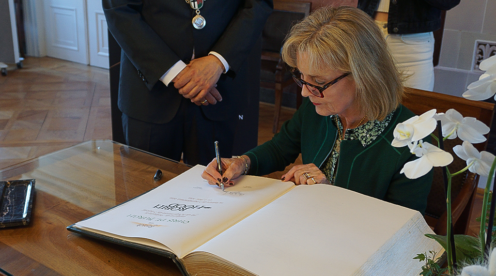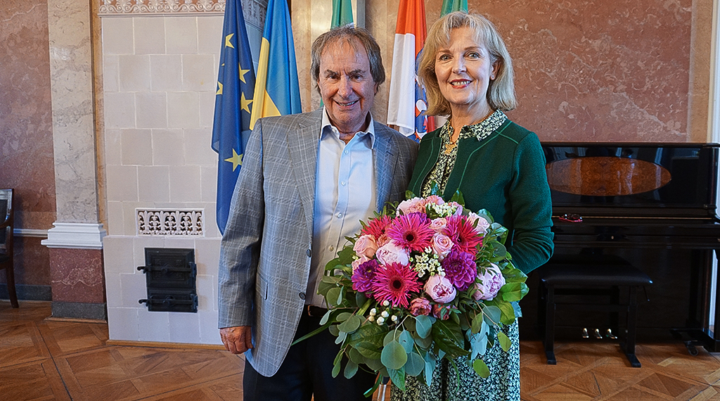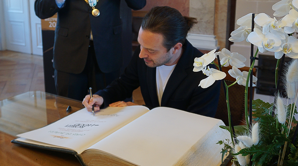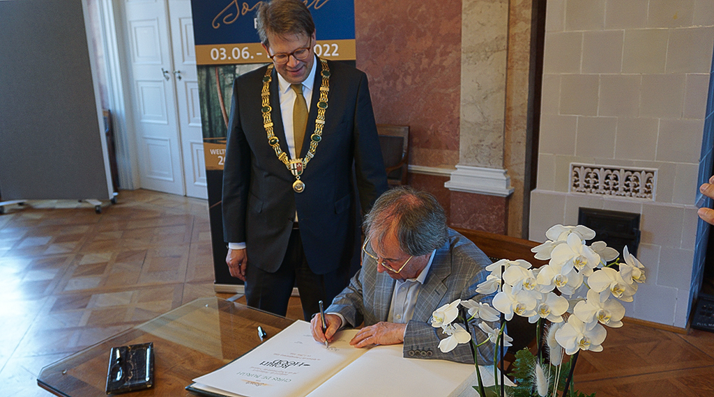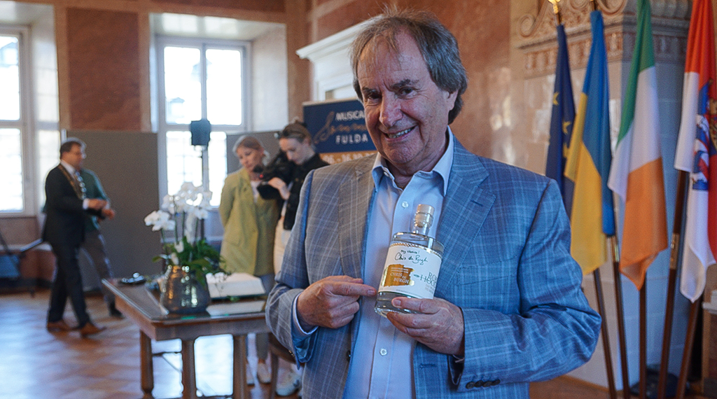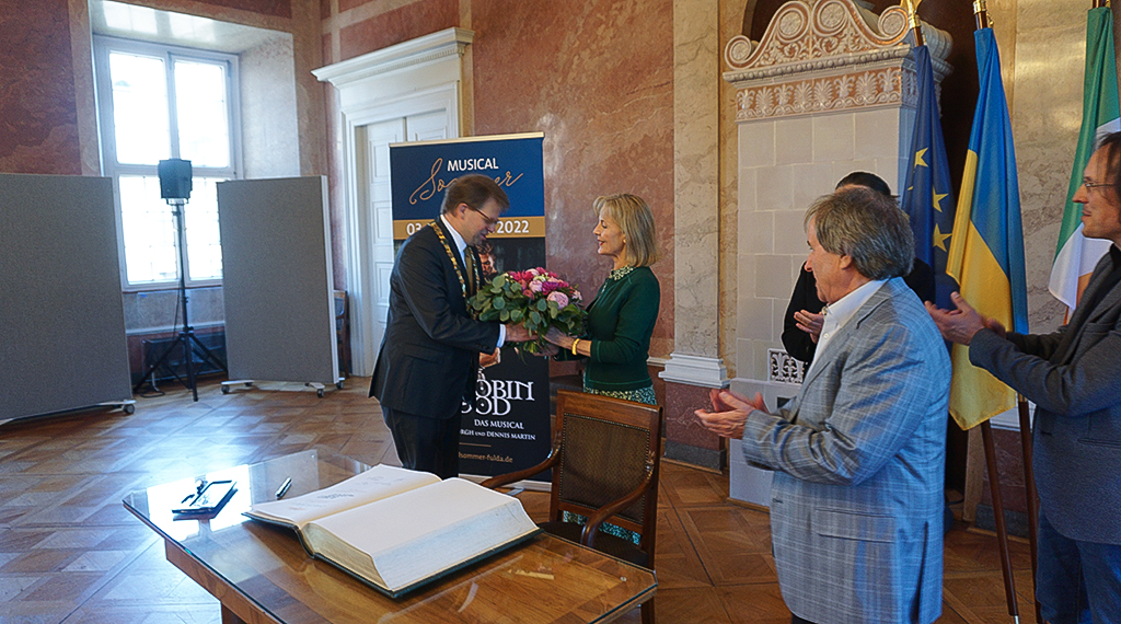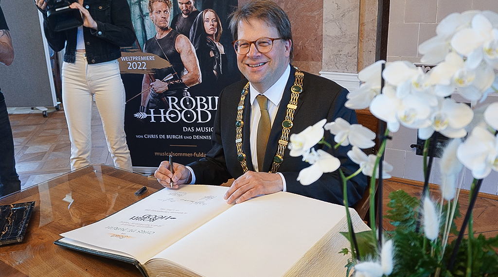 Der irische Singer-Songwriter und Komponist, Chris de Burgh, hat sich im Goldenen Buch der Stadt Fulda verewigt. Anlass für den Eintrag war die inzwischen dreijährige intensive künstlerische Zusammenarbeit mit dem Fuldaer Musical-Produktionsunternehmen „spotlight musicals“ und de Burgh für „Robin Hood – Das Musical“, das am morgigen Freitagabend im Fuldaer Schlosstheater welturaufgeführt und den Fuldaer Musical Sommer 2022 eröffnen wird. Neben de Burgh trugen sich heute auch seine Ehefrau Diane de Burgh, Fuldas Oberbürgermeister Dr. Heiko Wingenfeld (CDU) und die beiden geschäftsführenden Gesellschafter der spotlight musicals GmbH, Peter Scholz (Produzent) und Dennis Martin (Komponist und Librettist), im Marmorsaal des Fuldaer Stadtschlosses in das Buch ein.