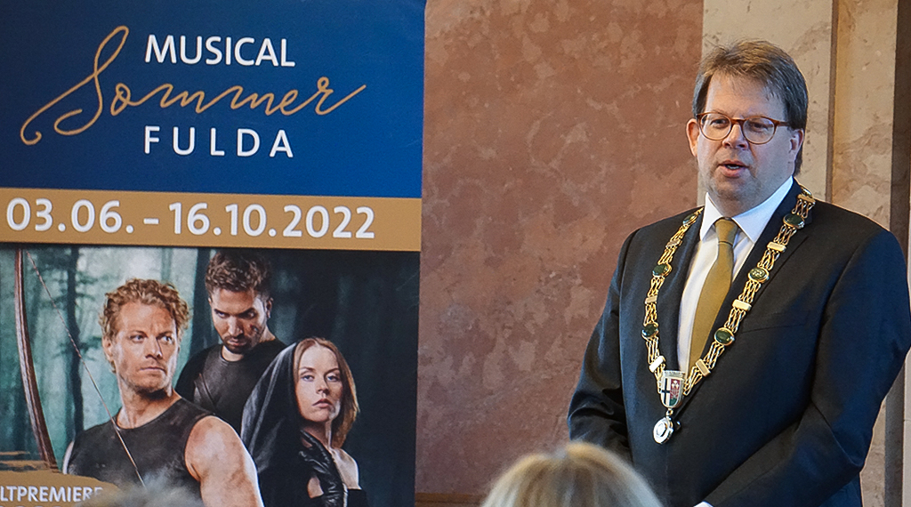 Oberbürgermeister Dr. Wingenfeld brachte heute seine persönliche Freude darüber, dass nach zwei Jahren Pandemie morgen Abend nun endlich Premiere gefeiert werden kann und brachte in diesem Zusammenhang die Bedeutung des Musical Sommers für die Stadt Fulda zum Ausdruck. Vor vielen Jahren hätten sich Dennis Martin und Peter Scholz auf den Weg gemacht, um in Fulda Kulturgeschichte zu schreiben. Etwas, das sich nicht nur bewährt, sondern auch bis heute Bestand hat. Dass Weltstar Chris de Burgh seit 1987 über so viele Jahre bis heute eine tiefe Verbundenheit zu Fulda pflegt, erfülle ihn als Oberbürgermeister nicht nur mit Stolz, sondern es sei auch „eine große Ehre.“
