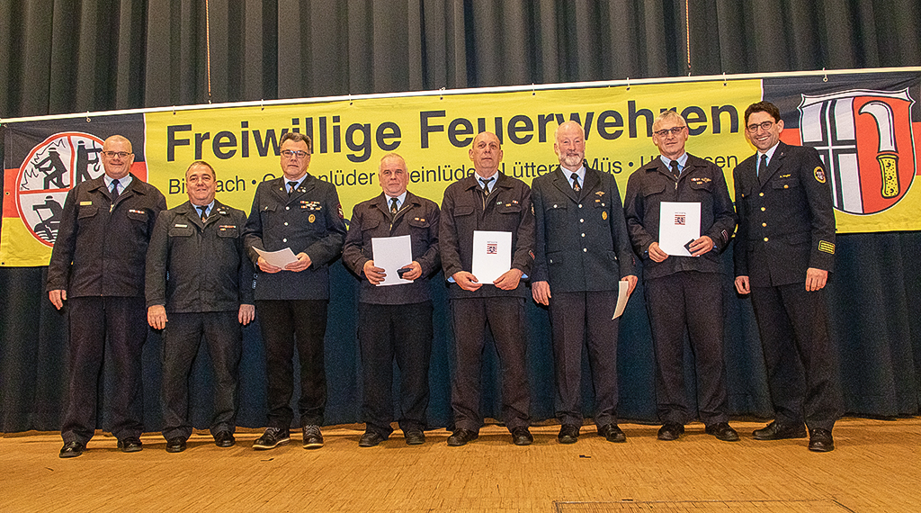 Nach seinem Bericht verkündete Jürgen Reinhardt, dass er sich nach 20 Jahren nicht mehr für das Amt des Gemeindebrandinspektors zur Verfügung stellt. Die Entscheidung habe er schon vor einem Jahr getroffen und sei ihm nicht leicht gefallen, „denn Feuerwehr ist mein Leben“, sagte Reinhardt. In seiner 20-jährigen Dienstzeit als GBI wurden über 2.000 Einsätze zum Wohle der Bürgerinnen und Bürger geleistet. „Den Standard, den wir heute in allen sechs Feuerwehren für selbstverständlich halten, konnten wir nur durch eine engagierte und vertrauensvolle Zusammenarbeit aller sechs Wehren erreichen“, betonte Reinhardt. Für ihn gab es auch schöne Momente, beispielsweise wenn sich Bürgerinnen und Bürger für den Einsatz der Feuerwehr bedankten. Auch Momente wie die Zapfenstreiche habe ihm sehr gut gefallen. Jürgen Reinhardt sprach auch die Momente an, die nicht so schön waren. „Wir hatten mit vielen schwer verletzte und tote Personen zu tun. Damit muss man umgehen können“, so Reinhardt. Persönlich war ihm die Förderung der Jugendfeuerwehr sehr wichtig. „Einer für alle, alle für einen“ sei eine Lebenseinstellung. „Ich danke euch für das Vertrauen, das ihr mir in all den Jahren entgegengebracht habt. Es war mir eine Ehre“, sagte Jürgen Reinhardt abschließend. Die Kameradinnen und Kameraden bedankten sich mit minutenlangem Standing Ovation.