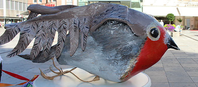 Das Rotkehlchen als Symbolfigur der Aktion verkündet gute Nachrichten auf dem Uniplatz in Fulda. Foto: Claudia Pfannemüller