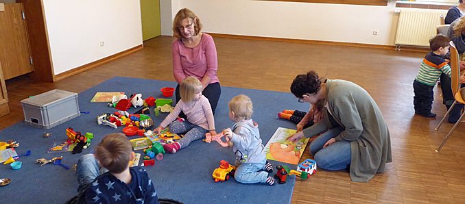 Im Anschluss gibt es ein gemeinsames Frühstück, bei dem die Kinder zusammen essen und die Eltern und Großeltern sich austauschen können. „Ich bringe gelegentlich ein pädagogisches Thema zu unserem Miniclub mit. Es geht beispielsweise um Sauberkeitserziehung, Trotzphasen und das Schlafverhalten der Kinder. Die Eltern können im Gespräch viel voneinander lernen – und sich Mut machen, wenn manche Dinge vielleicht nicht so klappen, wie sie sich das wünschen“, sagt die Erzieherin Jost-Hauser, die viermal in der Woche einen solchen Kurs anbietet. Meist nehmen zwischen zehn und zwölf Erwachsene mit ihren Kindern an den Treffen teil, viele kommen sogar aus den Nachbarkreisen. Und einige der Mütter waren früher selbst im Miniclub und besuchen ihn heute mir ihren eigenen Kindern.
