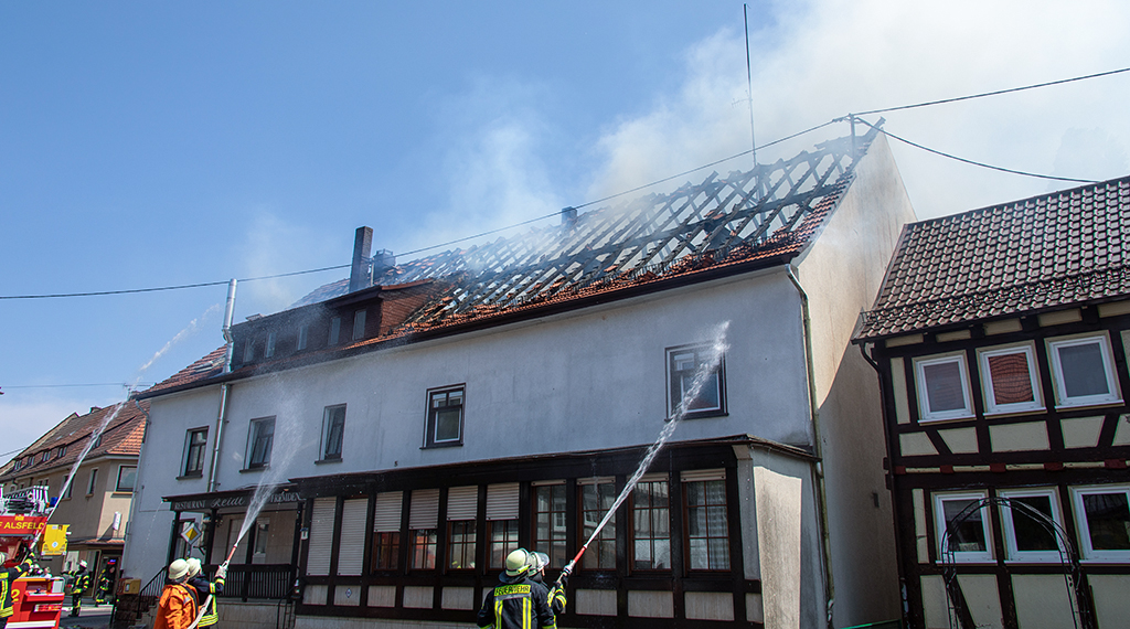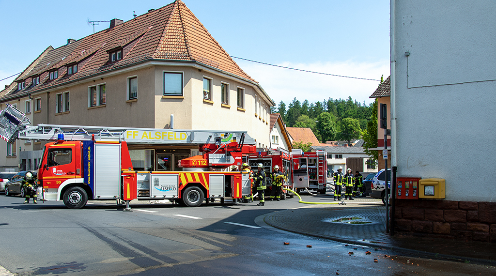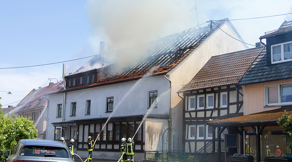 Ein Großfeuer in einem als Wohnhaus genutzten alten Gaststättengebäude im Ortskern von Grebenau im Vogelbergkreis hat am Montagnachmittag bis zum Abend über 100 Löschkräfte in Atem gehalten. Zum Eintreffen stand der Dachstuhl des zweigeschossigen Gebäudes mitten im Ort lichterloh in Flammen. Der Feuerwehr gelang es, alle acht Bewohner aus dem brennenden Haus in Sicherheit zu bringen. Durch Funkenflug drohte sich das Feuer im Ort auszubreiten, Grünflächen in der Umgebung hatten bereits Feuer gefangen. Nur durch einen massiven Löschangriff von mehreren Seiten und über Drehleitern konnte der Brand gelöscht werden. Die Arbeiten dauerten bis in den Abend. Schadenshöhe und Brandursache sind noch unklar. +++
