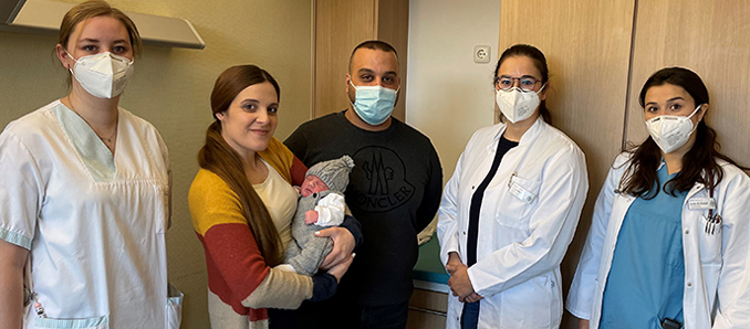 Sophia Stein (Pflegekraft Geburtshilfe), Linda Smaili mit Yasser, Youssef El-Faour, Tina Liebau (Ltd. Oberärztin) und Leila Al-Khalaf (Assistenzärztin)
